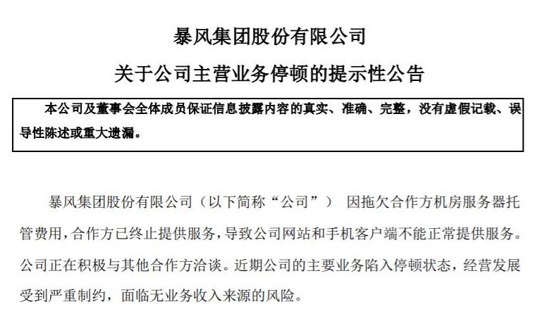 同時,暴風在公告中提醒,近期公司的主要業務陷入停頓狀態,經營發展受到嚴重制約,將面臨無業務收入來源的風險,存在經審計后2019年末歸屬于上市公司股東的凈資產為負的風險,暴風股票存在被暫停上市風險。